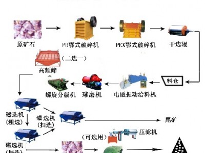 原矿经过两次鄂式破碎破碎后进入料仓中,料仓下方设电磁振动给料机,电磁振动给料机均匀将矿物给入球磨机中,磨矿产品经分级机分级,粗砂返回磨矿流程,细砂进入一段磁选,磁选尾矿抛弃,精矿进入二段磨矿,第二段磨矿为细磨,磨矿产品直接进入磁选机进行二段磁选,二段磁选为一磁粗选,一次精选流程,对一般类型的磁铁矿已可达到理想精矿品位,如遇特殊情况需另外考虑。